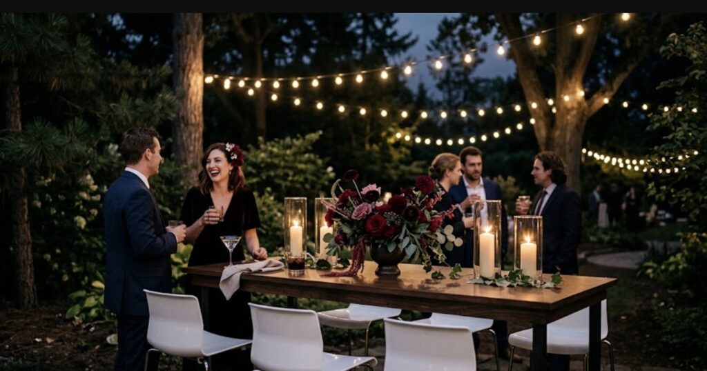 - Metal and powder-coated frames: Clean lines and durability make these a solid choice for outdoor events. White or black metal chairs and tables photograph well in both sunlight and evening settings. They do tend to hold heat in the afternoon sun, so consider this when placing seating.