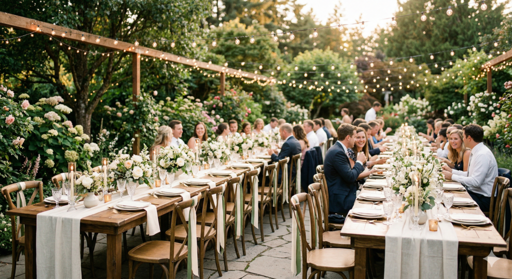 - Warmer linen tones: introduced through napkins or chair sashes, swapping crisp white for champagne, terracotta, or deep burgundy